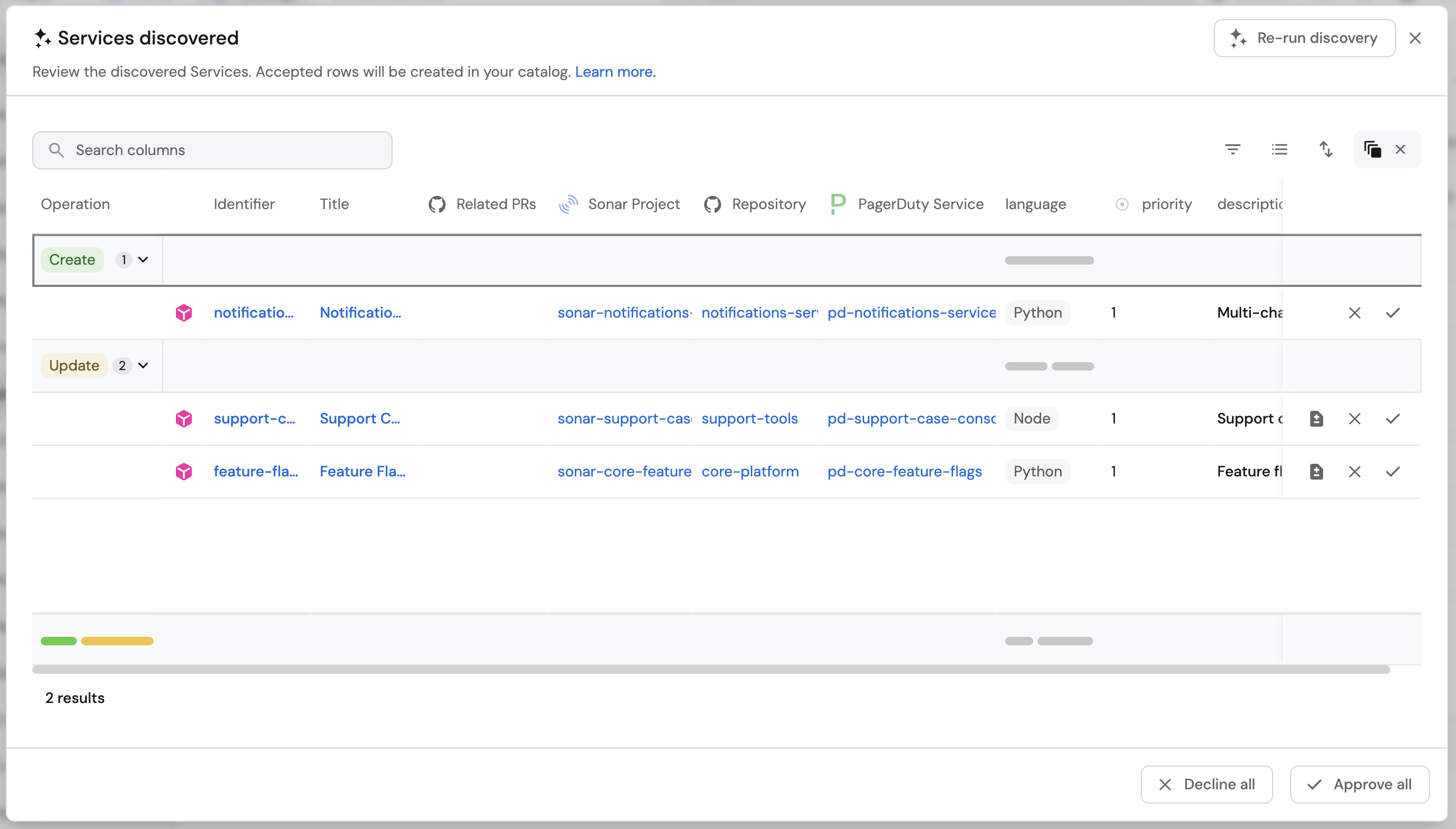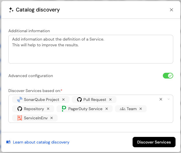 • Services: A service can be identified through various sources such as Jira projects, Snyk projects, PagerDuty services, Sonar projects, or a combination of these. Since no single integration fully represents the service, catalog discovery can analyze these related entities to suggest services.