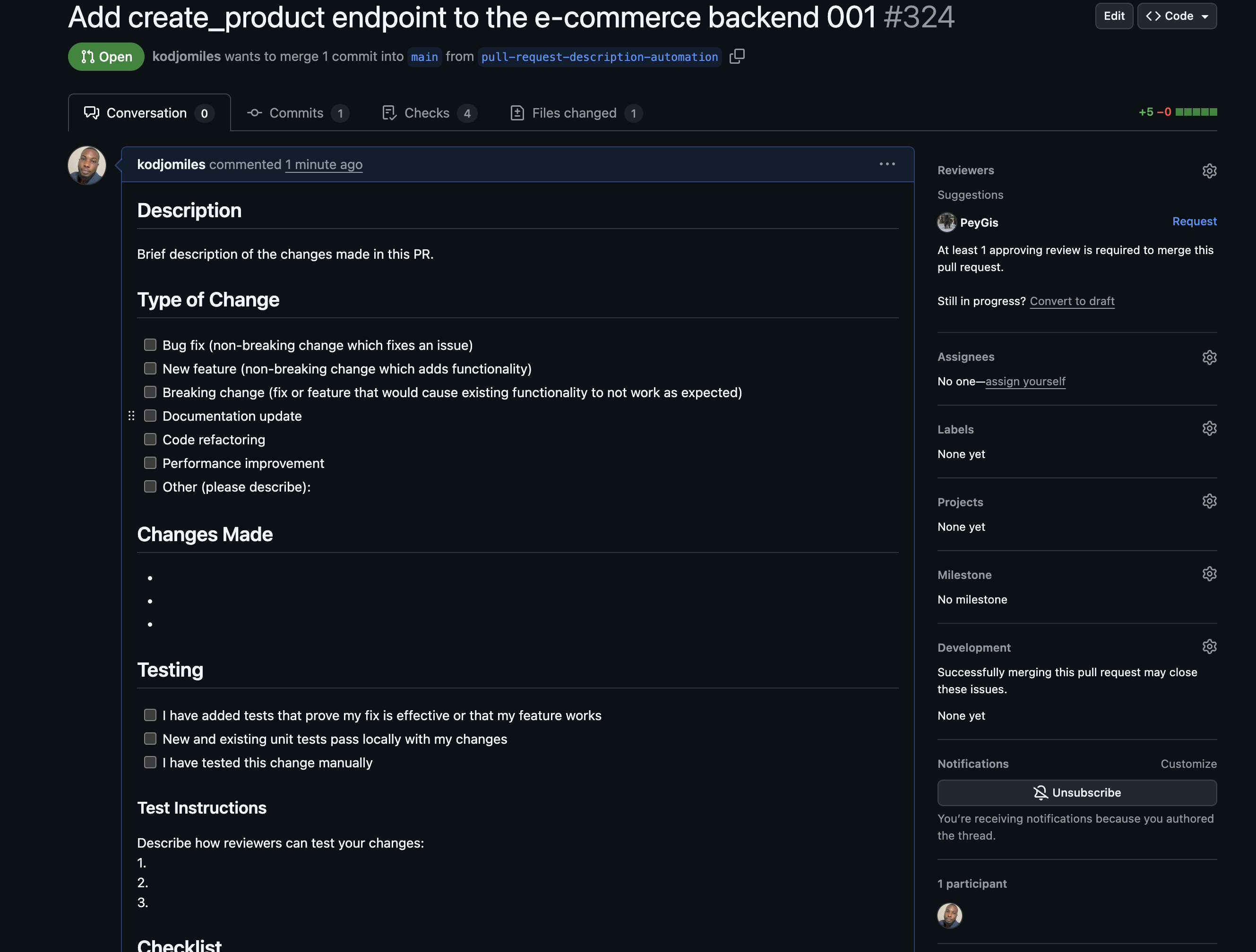 - Template compliance: Automatically generate descriptions that match organization-specific PR templates.