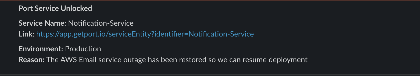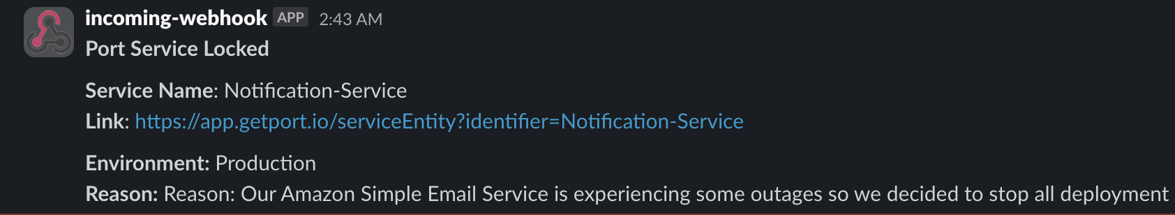 Below is the result of successful service lock and unlock alerts sent to a Slack channel after triggering the actions:
