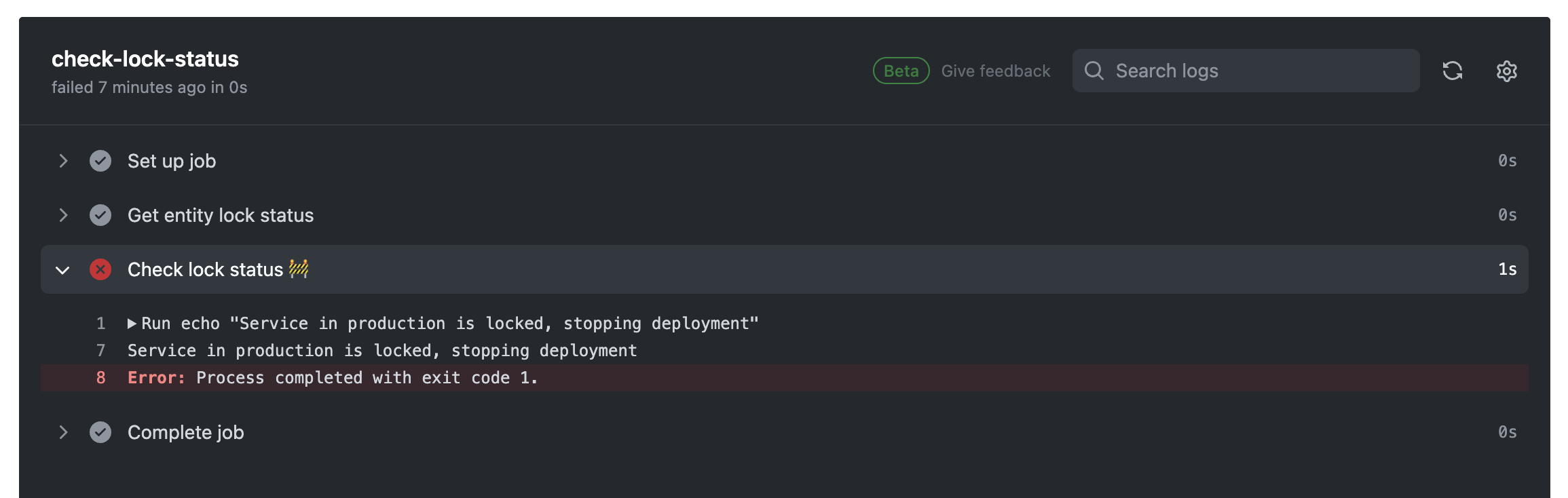 If you try to push code to your repository when the locked_in_prod field is set to true, the deployment workflow will stop: