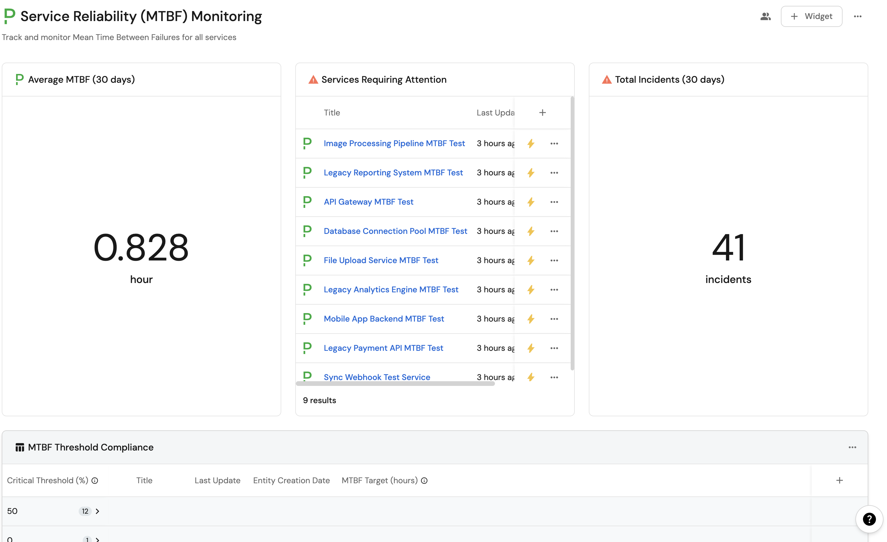 With your MTBF data and monitoring actions in place, you can create a dedicated dashboard in Port to visualize service reliability, track MTBF trends, and quickly identify services that need attention.