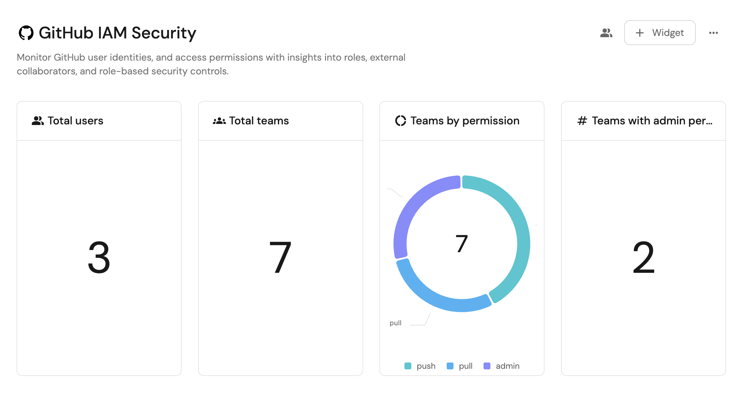 Once the GitHub data is synced, we can create a dashboard and add widgets to monitor IAM.